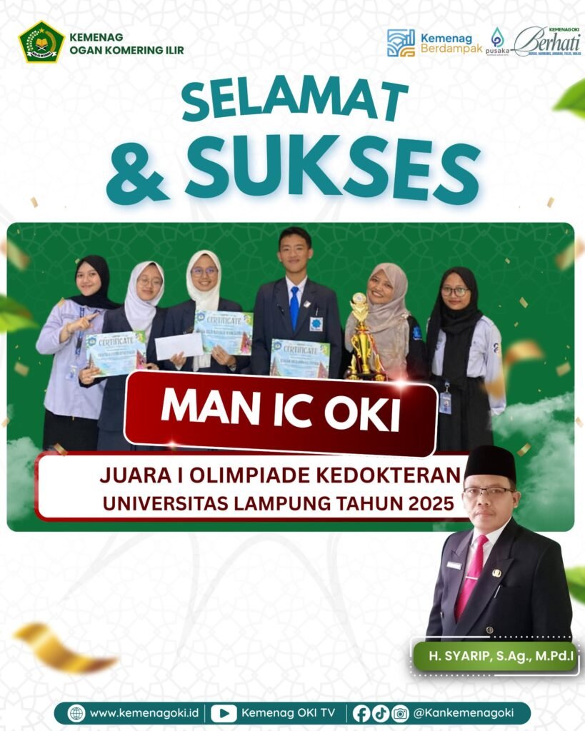 Kayuagung (Kemenag OKI) — Kepala Kantor Kementerian Agama Kabupaten Ogan Komering Ilir (OKI), H. Syarip, S.Ag., M.Pd.I, menyampaikan ucapan selamat dan sukses atas prestasi membanggakan yang diraih oleh siswa MAN Insan Cendekia (IC) OKI, yakni Safira, Calya, dan Ichsan, yang berhasil meraih Juara I Olimpiade Kedokteran Universitas Lampung (UNILA) Tahun 2025.