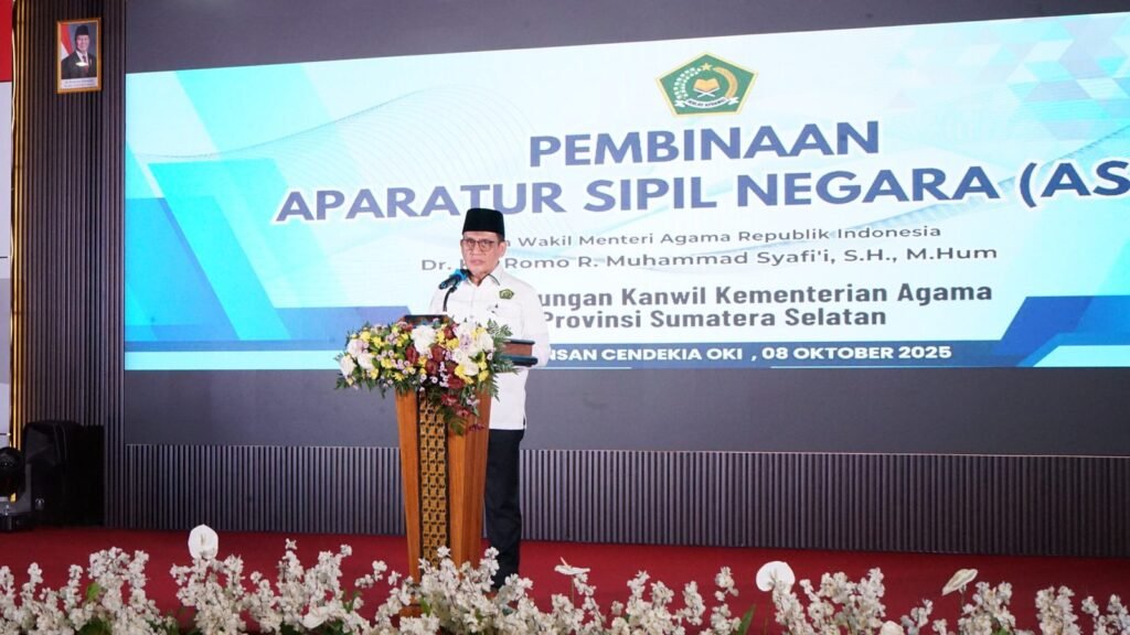 Kayuagung (Kemenag OKI) — Wakil Menteri Agama Republik Indonesia, Romo H. R. Muhammad Syafi’i, memberikan pembinaan kepada Aparatur Sipil Negara (ASN) di wilayah Kementerian Agama Provinsi Sumatera Selatan. Kegiatan berlangsung di Gedung Auditorium Madrasah Aliyah Negeri Insan Cendekia (MAN IC) OKI, Rabu (8/10/2025).
